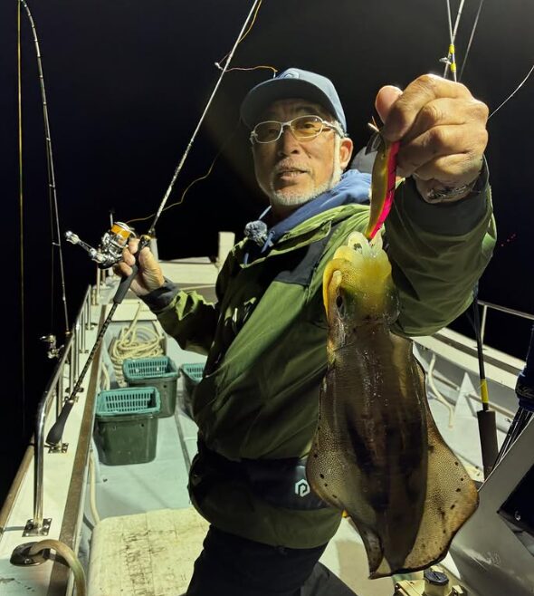 今回はアオリイカでお馴染みの「重見プロ」と、ジグメーカー「プレッジ」、怪魚ロッドでお馴染みの「ツララ」の方々にご乗船いただきました。