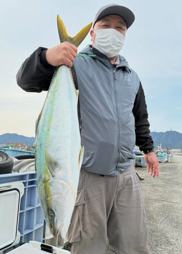 開始して割と早めに、待望の鰤がヒットしてくれます。無事に上がってきたのは、8キロほどの見事な腹パンサイズです。